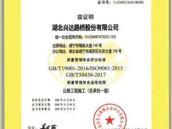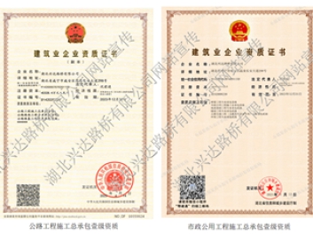 湖北興達路橋有限公司成立于1998年3月,是國家住建部、省住建廳批準的具有公路工程施工總承包壹級、市政公用工程施工總承包壹級、橋梁工程專業(yè)承包壹級、公路路面工程專業(yè)承包壹級、公路路基工程專業(yè)承包壹級、隧道工程專業(yè)承包貳級、地基基礎(chǔ)工程專業(yè)承包貳級、環(huán)保工程專業(yè)承包貳級、公路交通工程(公路安全設(shè)施分項)專業(yè)承包貳級資質(zhì)的施工企業(yè)。