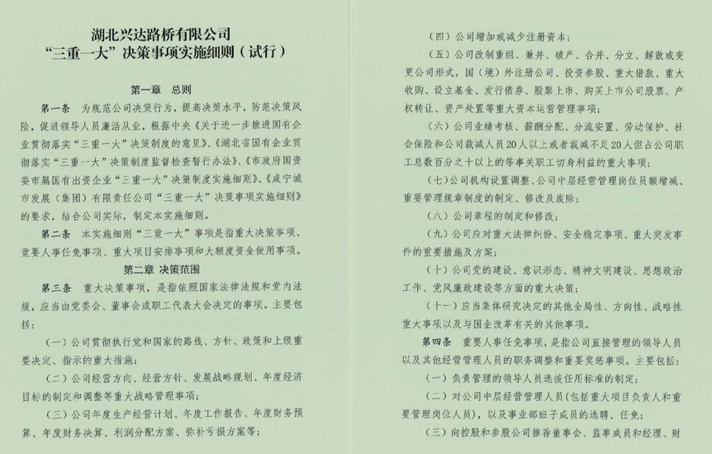 湖北興達路橋有限公司 "三重一大"決策事項實施細則(試行) 發(fā)布時間: 2023-07-24 瀏覽次數(shù): 0 作者: 興達路橋 上一篇: 沒有了 下一篇: 湖北興達路橋有限公司黨委會議事規(guī)則